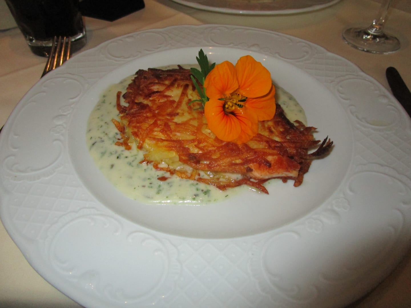 Lachs in Kartoffelkruste mit Kräutersoße