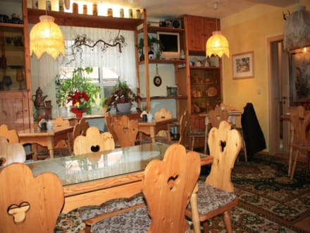 Hauseigenes Cafe mit Kachelofen und Echtholzmöbeln