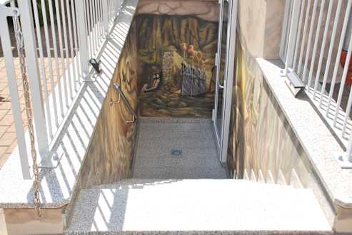 AußenansichtNotausgang und Eingang, malerisch eingegettet in das Höhlengleichnis von Platon