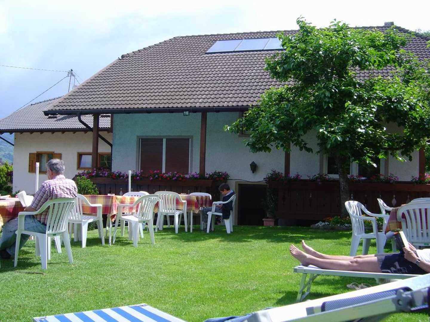 Pension EtschblickZu sehen ist eine Außenaufnahme der "Pension Etschblick" hier: Gartenanlage mit Liegestühlen und Pool.