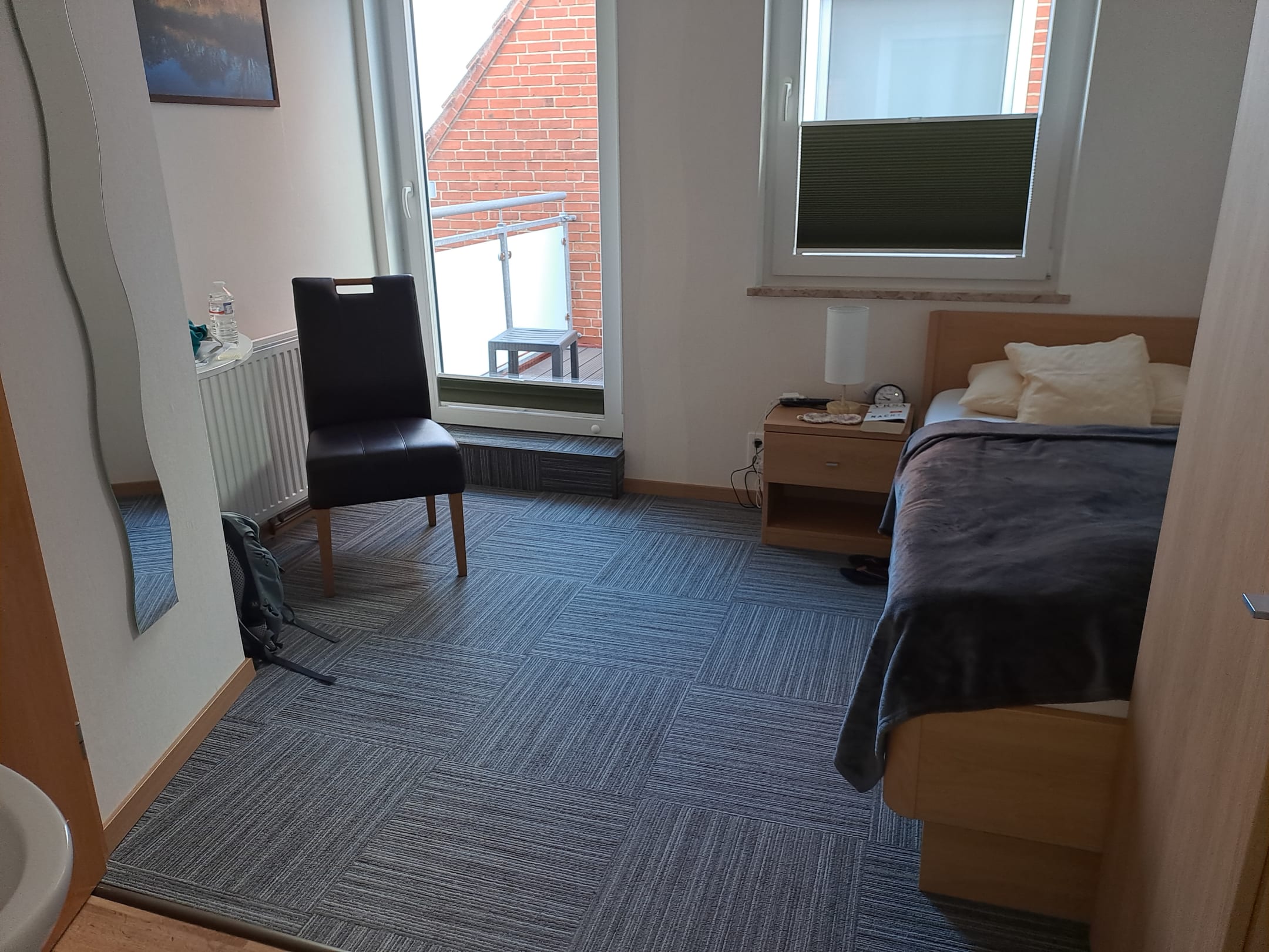 ZimmerGemütliches Einzelzimmer mit kleinen Balkon und Fernseher am Bett.Und Balkon mit Blick auf das Meer und Watt.