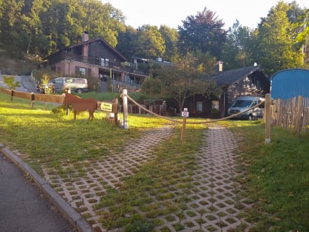 FeWo Birke ist im DG des unteren, rechten Blockhauses; Parkplatz davor darf nicht für die FeWo genutzt werden. Im oberen Blockhaus befindet sich im EG die FeWo Buche.