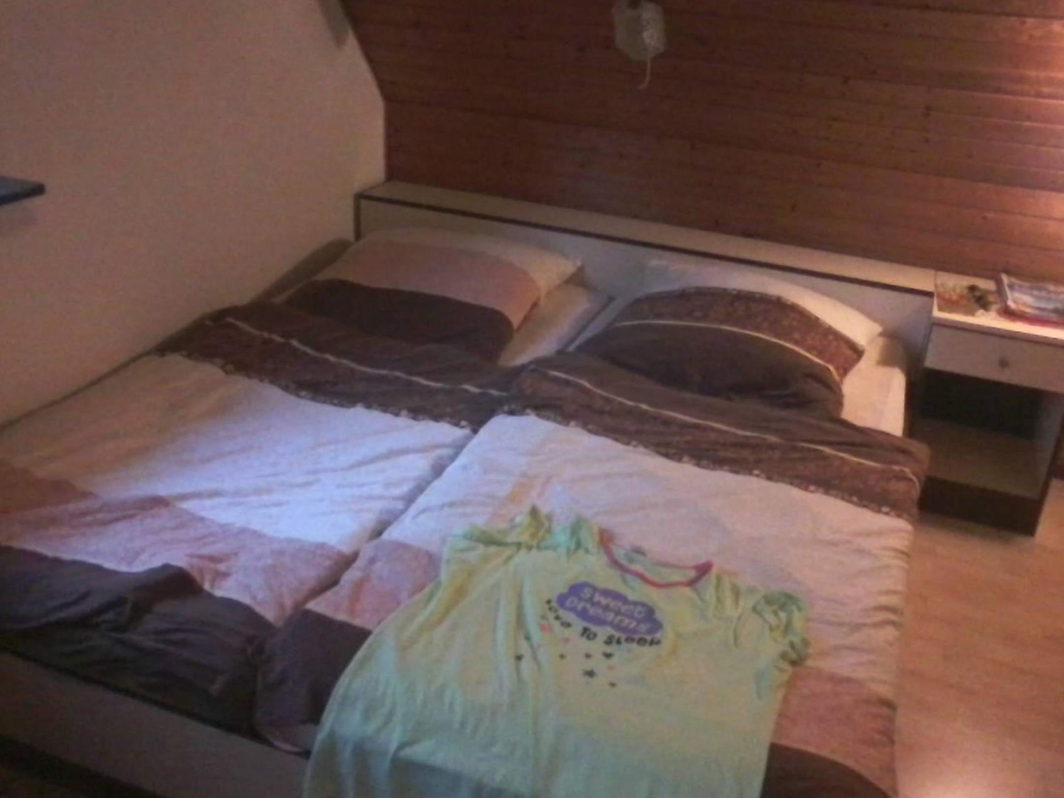 Das Bett stand in der Ecke und war für einen von uns nur umständlich zu besteigen, eine von zwei Lampen über dem Bett hatte einen Wackelkontakt und hing lose an der Holzverkleidung.