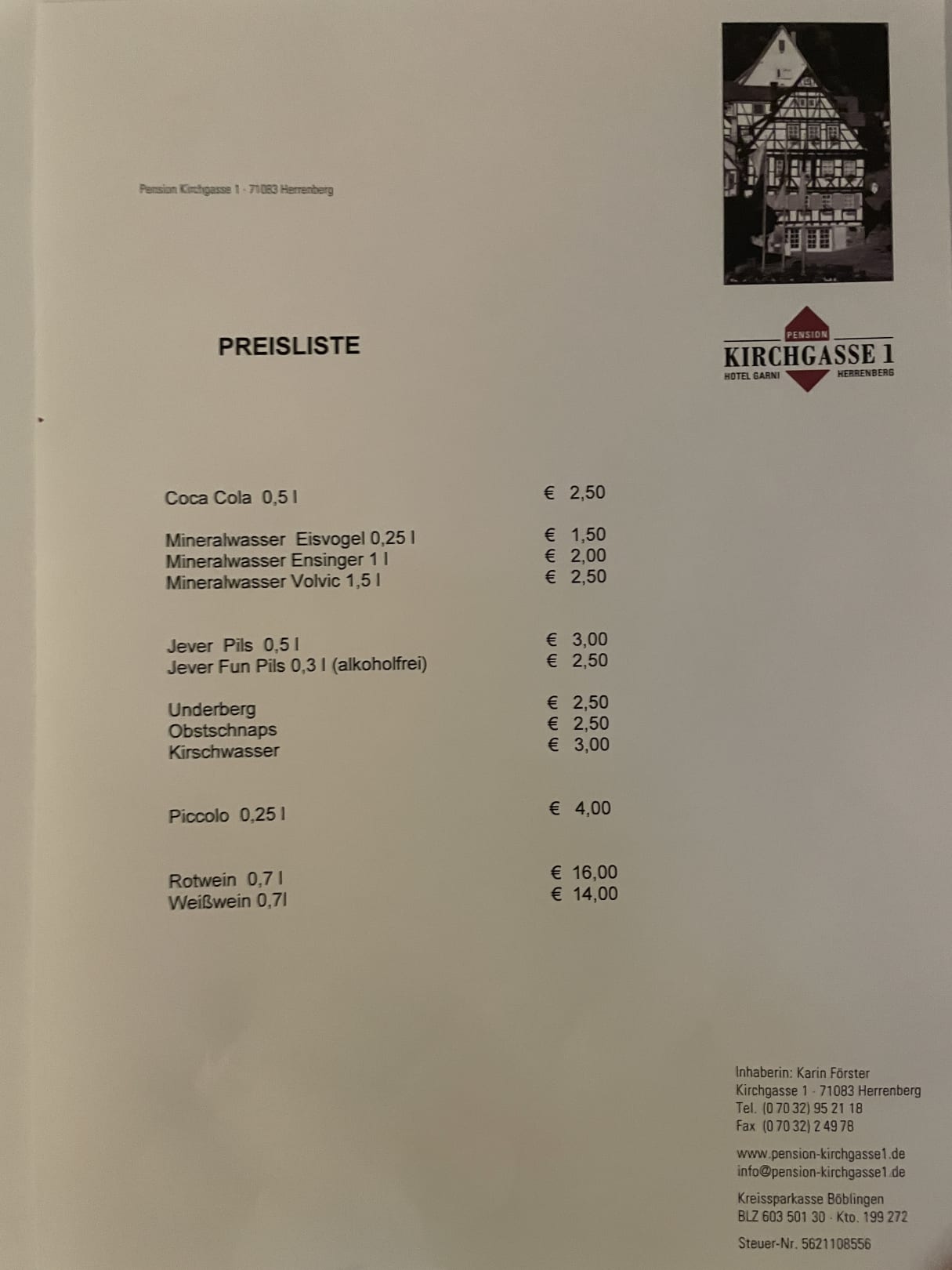 Preisliste für Getränke im Gemeinschaftsraum
