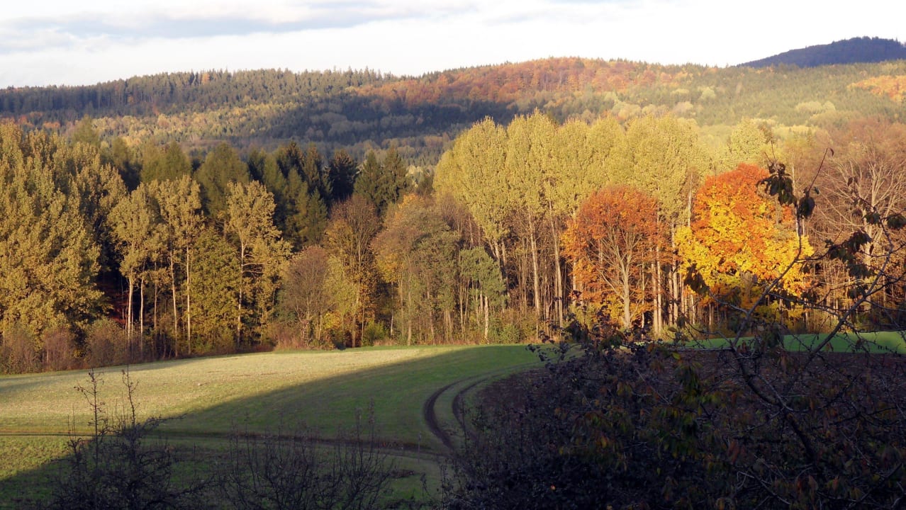 Blick vom Fenster über die Felder in den Wald