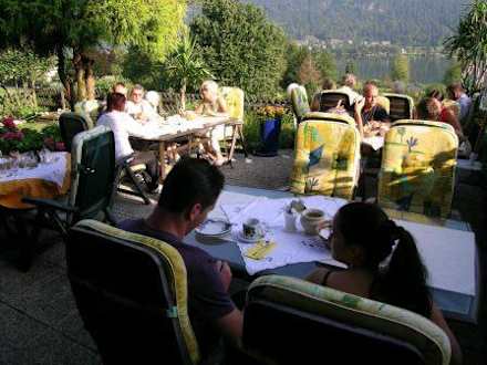 Frühstücksterrasse mit Blick auf See und Berge