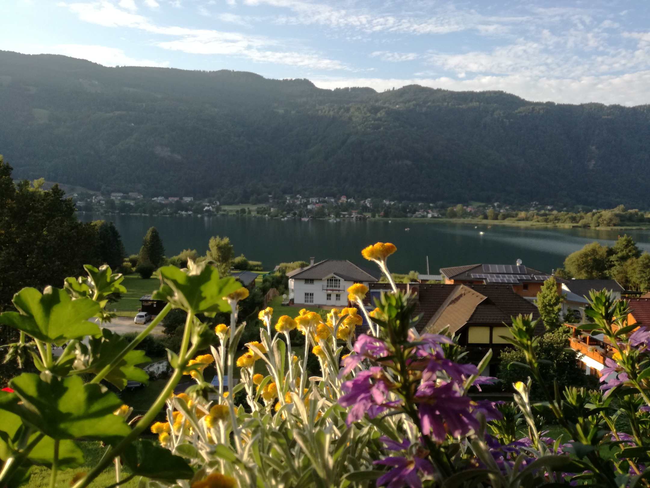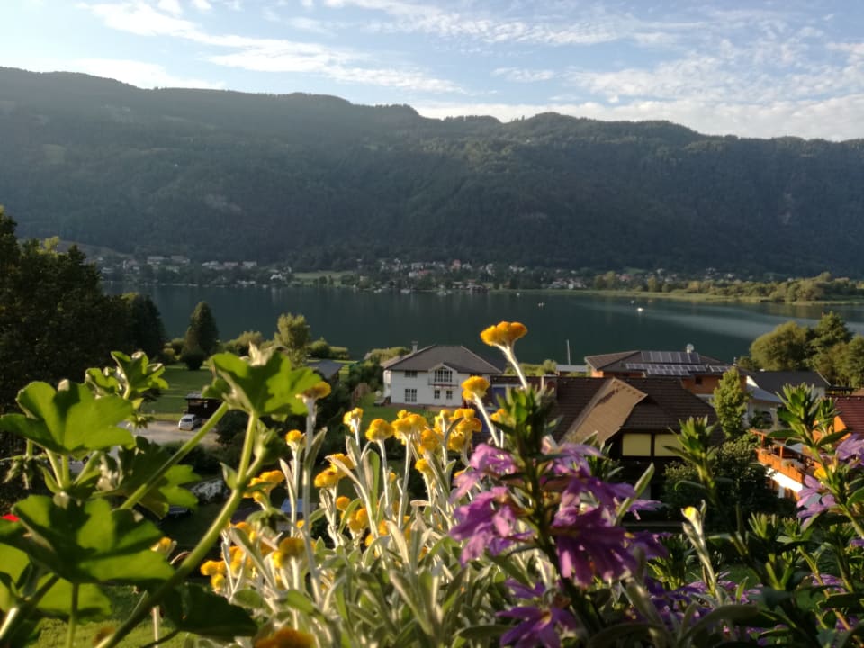 Ausblick vom Balkon - Gästezimmer, direkt darunter sieht man den großen eigenen Badestrand ca 50 m von der Pension entfernt. Außerdem verfügt jedes Zimmer über einen eigenen Balkon mit See- und Bergblick.