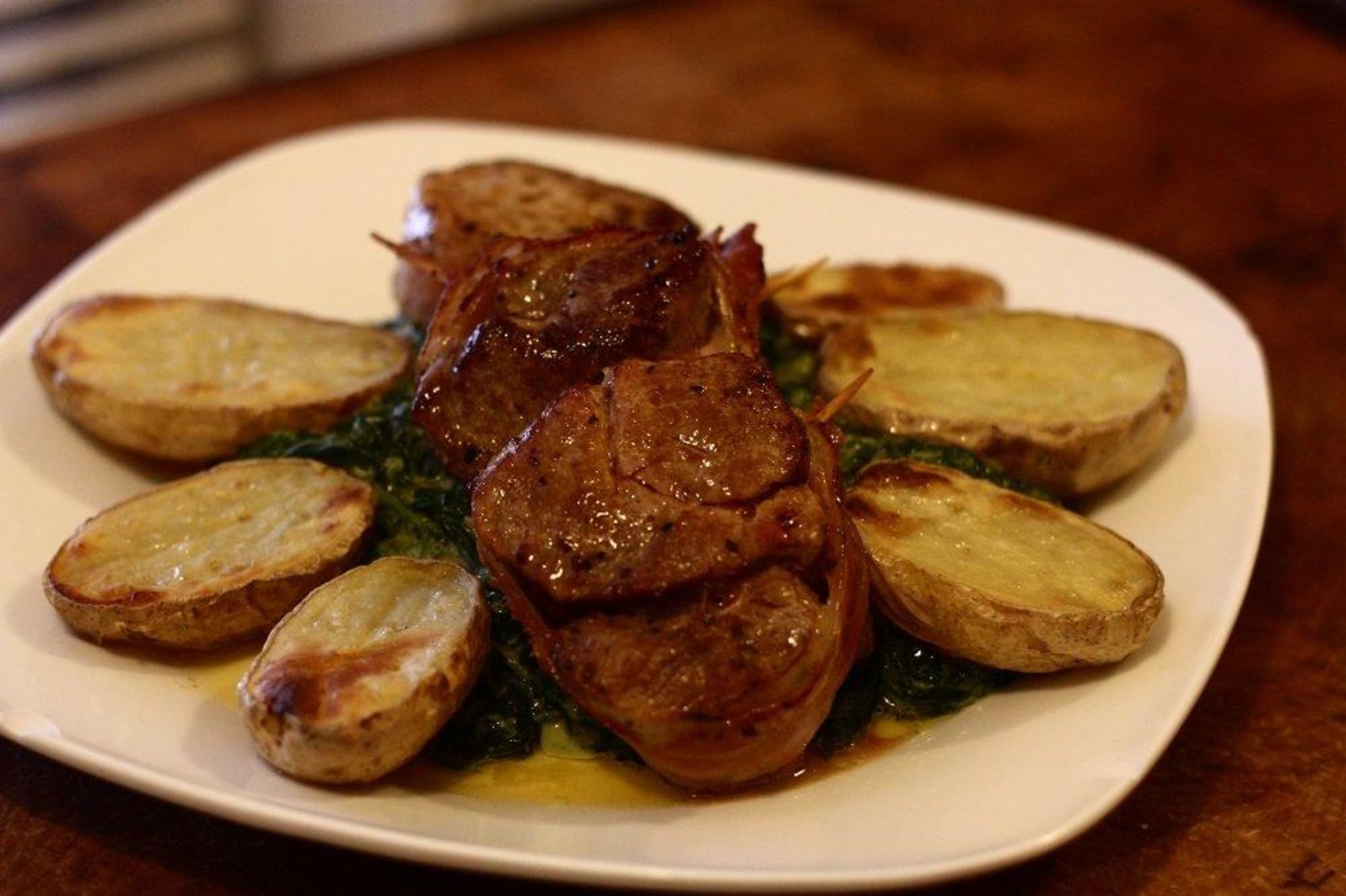 Vepřové medajlonky, pečené brambory, špenát
