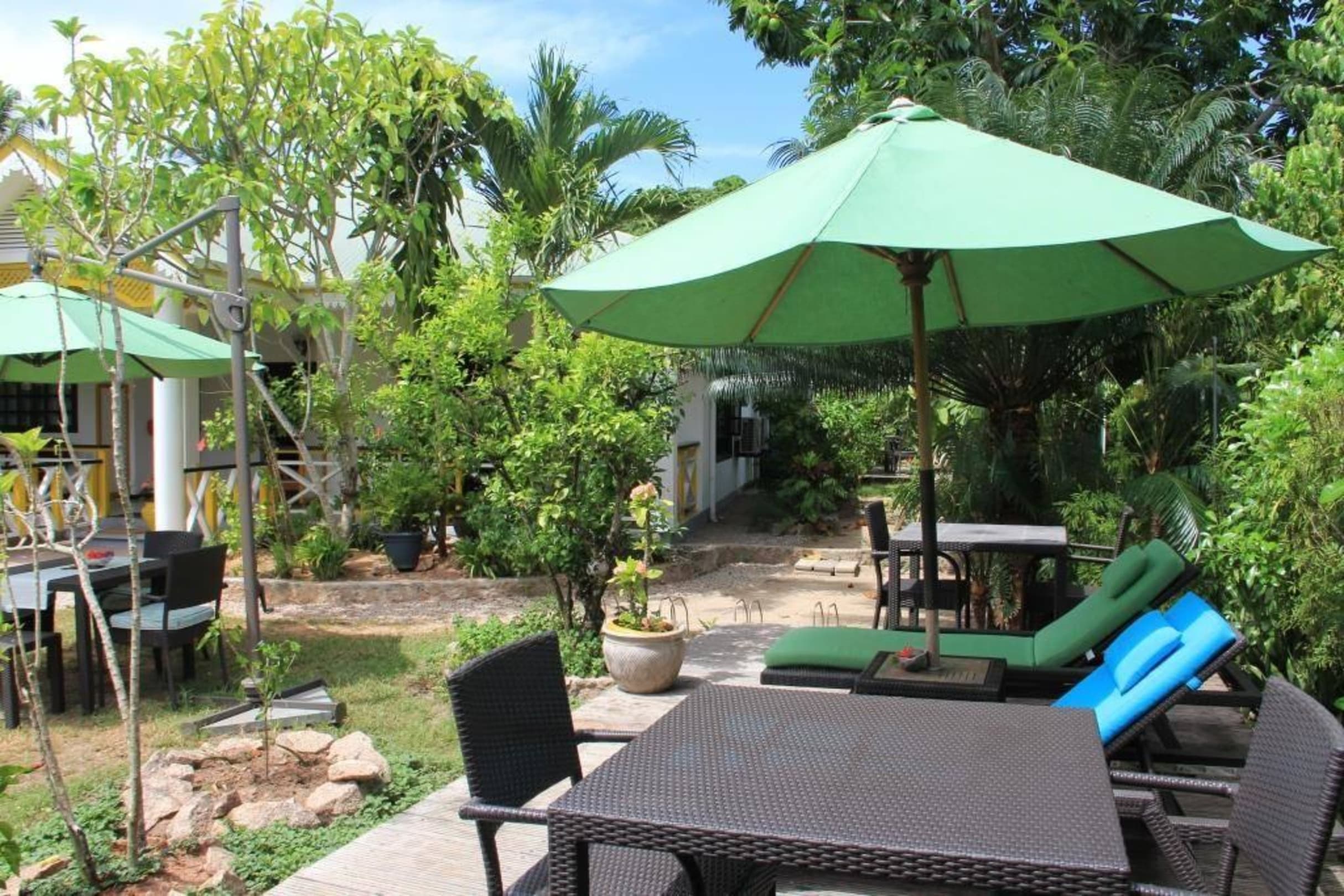 Liegen und Tische im Garten