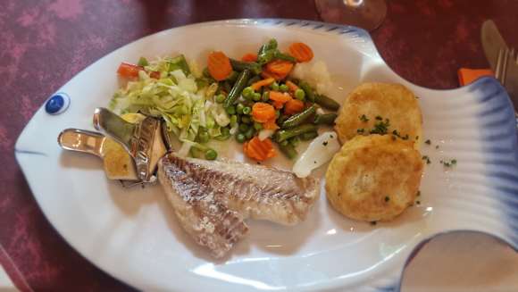 Gebratenes Rotbarschfilet mit buntem Gemüse und Kartoffelplätzchen