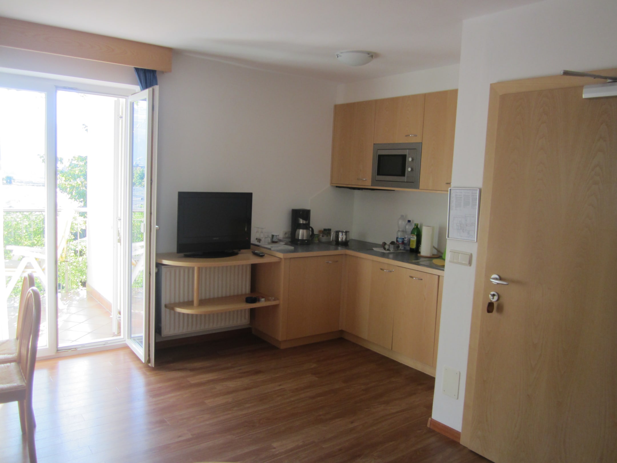 Wohnzimmer mit Küchenzeile und Essecke, Balkontüre (Ostseite)