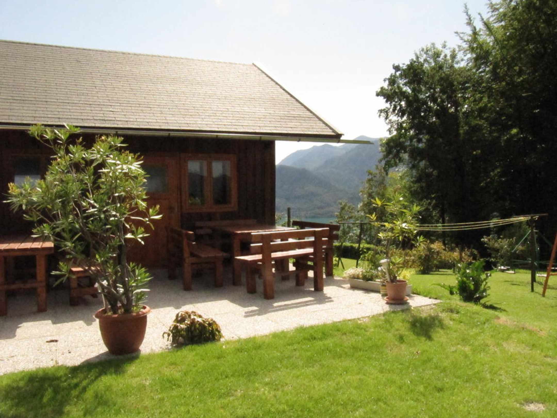 Blick auf die Terasse und die Aufenthaltshütte