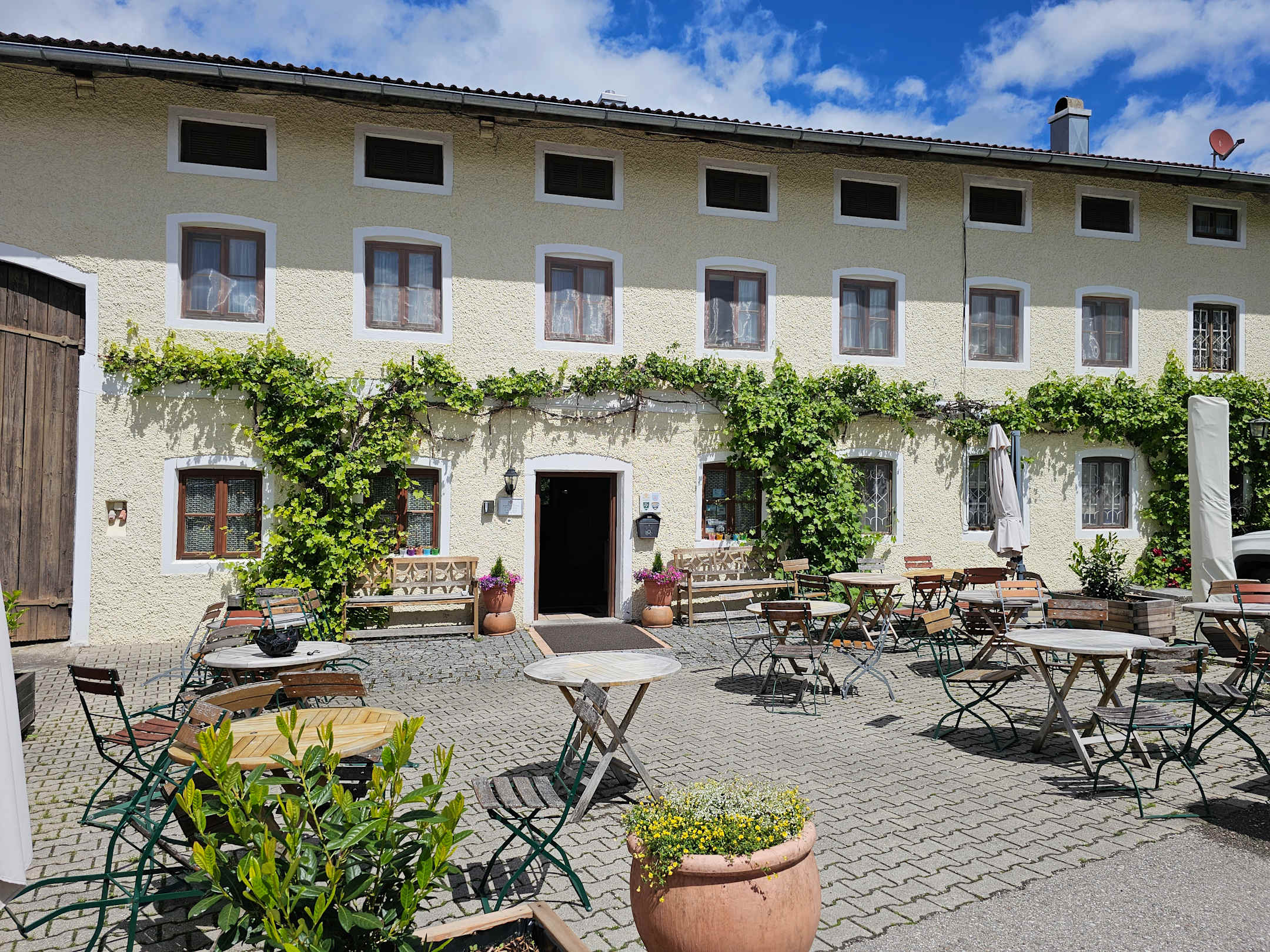 Hauptgebäude mit Eingang zum Frühstücksraum/Aufenthaltsraum und Rezeption; Biergarten