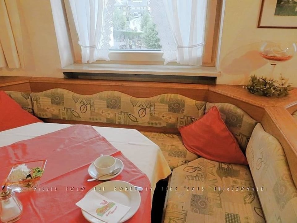 An einem Tisch im Frühstücksraum mit Fensterblick