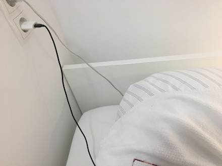 Die Kabel für die Lampe hängen über das Bett