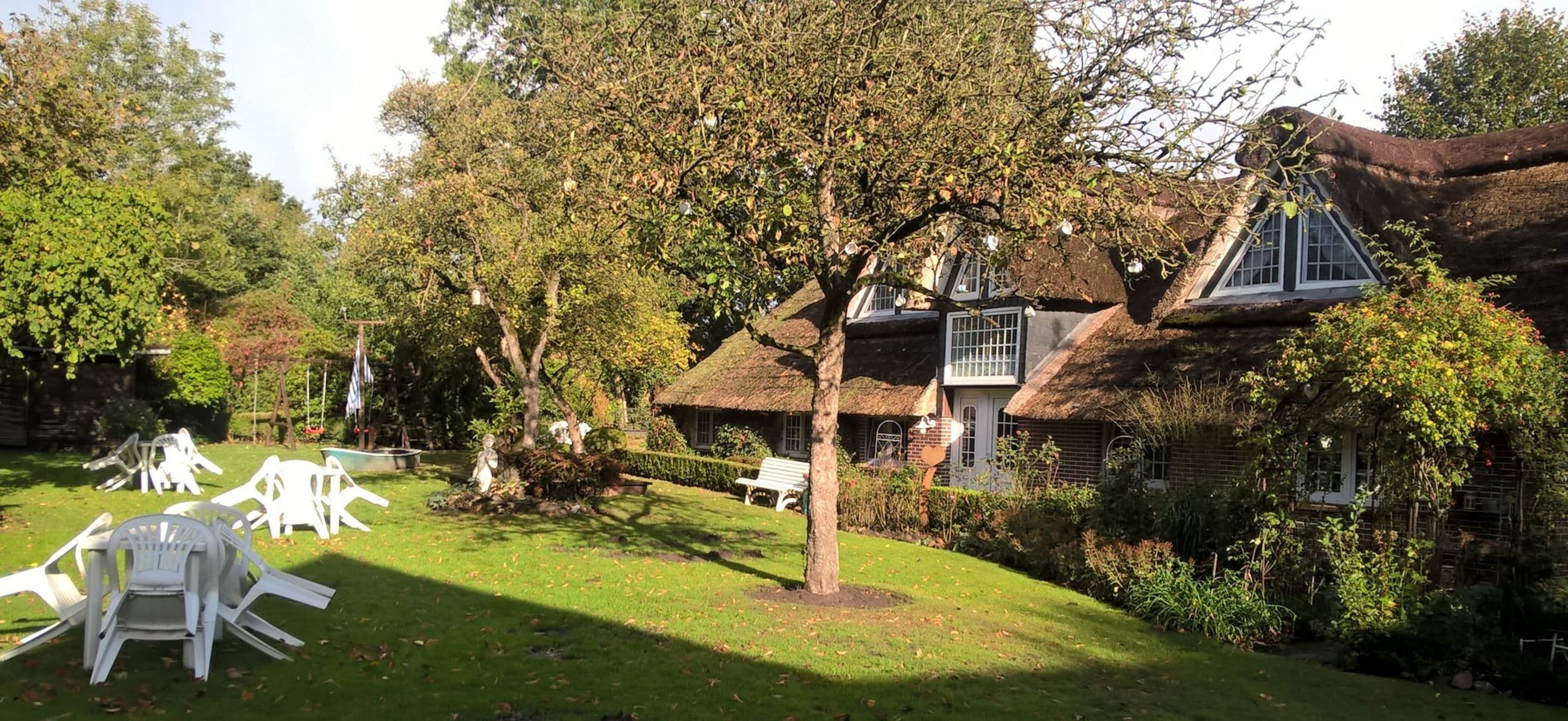 Ausblick vom Frühstücksraum auf die Liegewiese / schön gestaltetem Garten