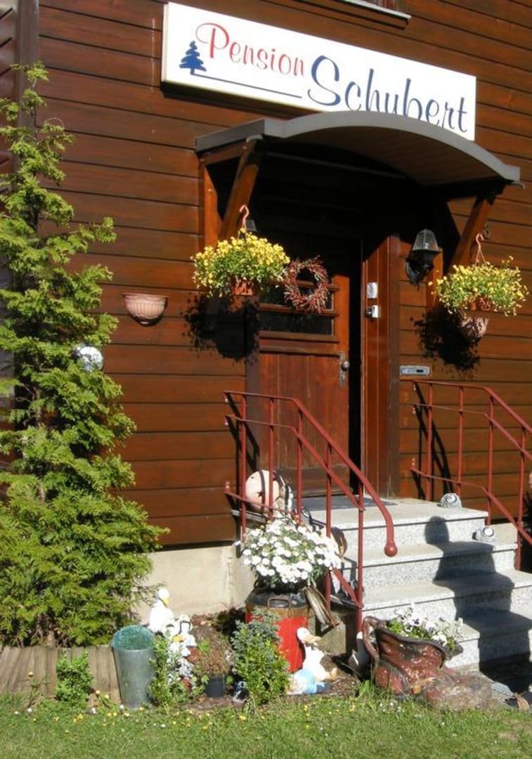 Pension SchubertEingang der Pension. In dem kleinen Garten vor der Tür stehen auch ein paar rustikale Ruhebänke.