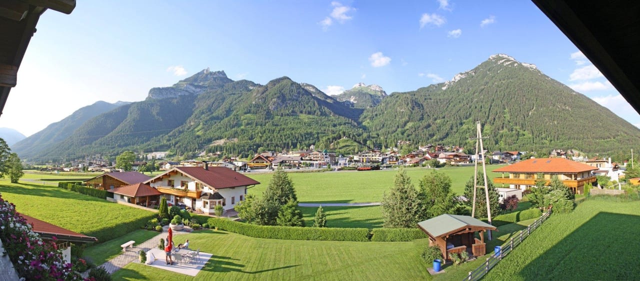 Panorama - vom Balkon auf Ort, Dampfzug und Rofan