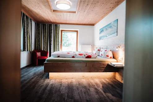 ZimmerSchlafzimmer der Ferienwohnung Lechtal für 2-4 Personen mit Balkon und Blick auf den Ort Bach
