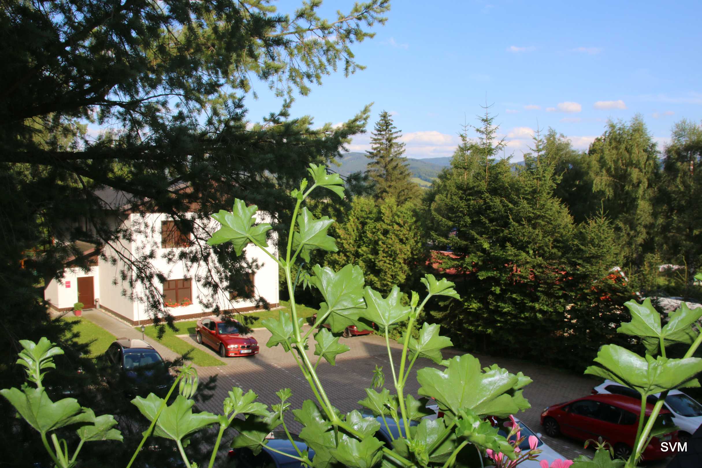 Blick aus dem Zimmer auf den hauseigenen Parkplatz. Dahinter dann in Richtung Stadt.