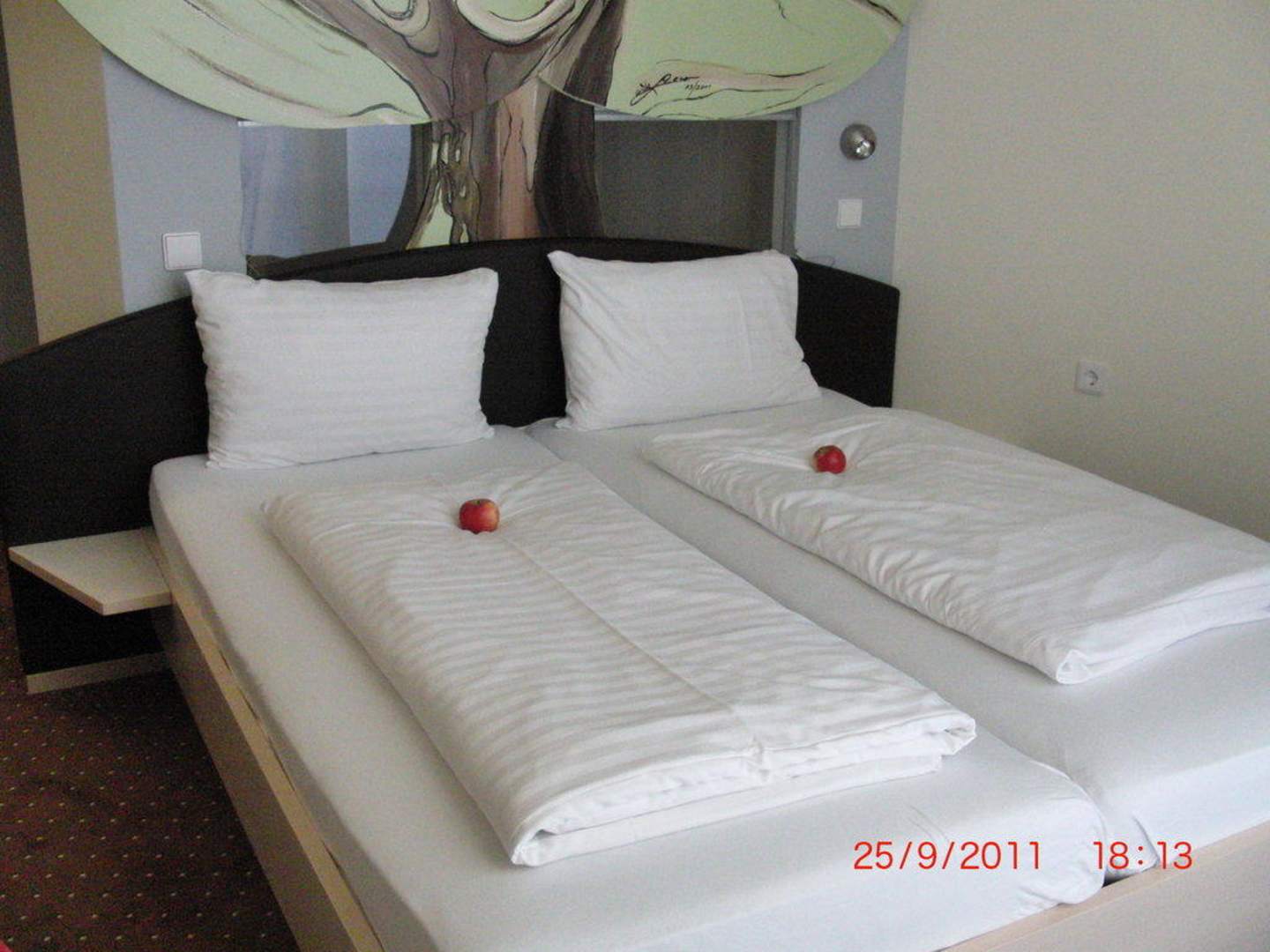Doppelbett, Schlafbereichsehr nett waren die Äpfel, die wir bei unserer Ankunft vorfanden