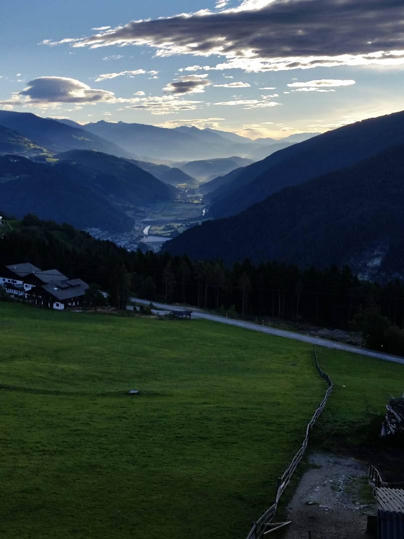 Balkonaussicht ins Pustatal am Morgen.
