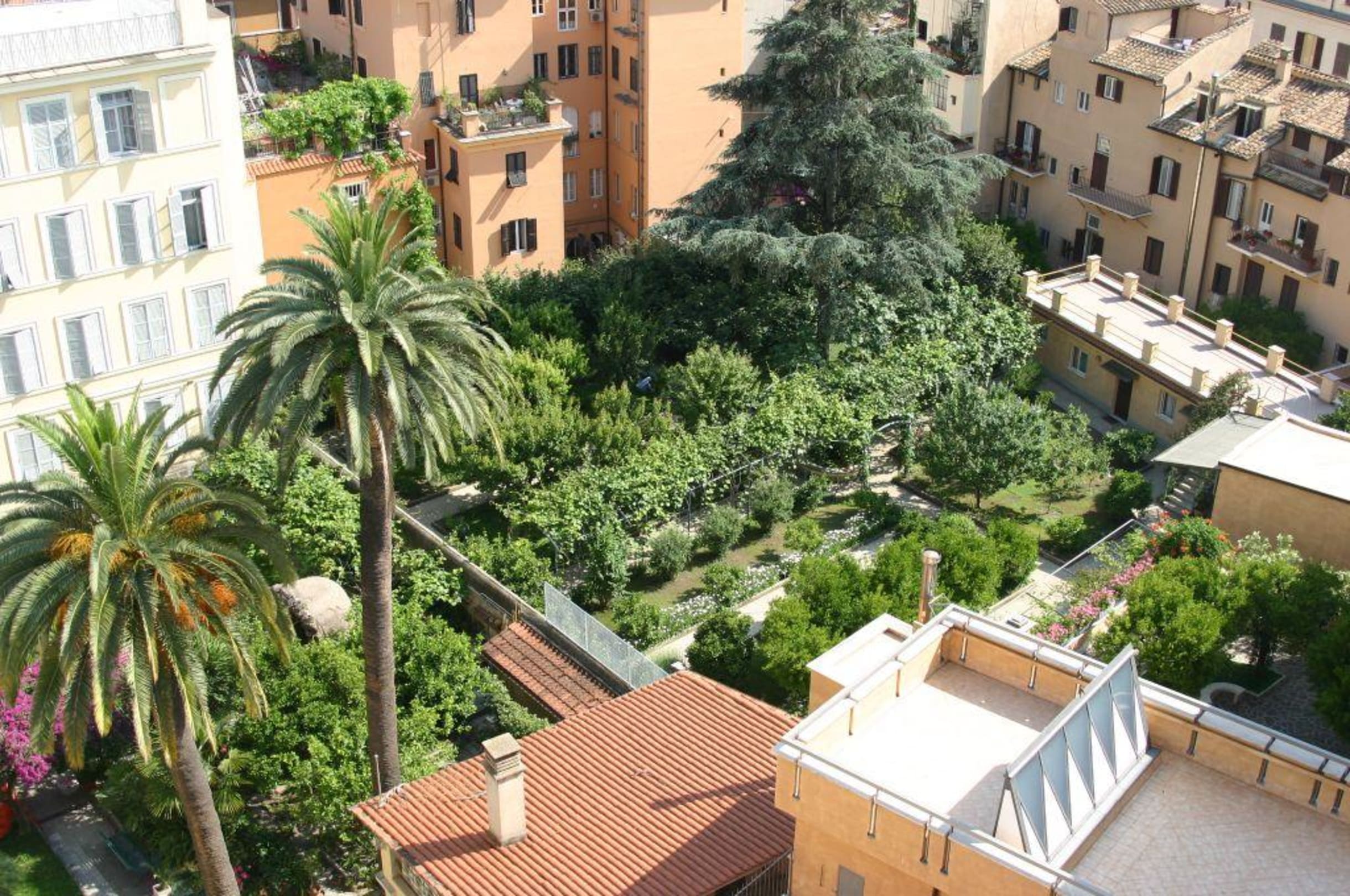 Ausblick von der Dachterasse in den Garten des Klosters.