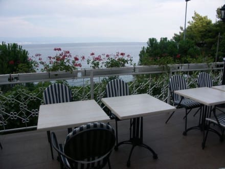 TerrasseBlick von der Terasse in Richtung Meer. Hier wird auch das Frühstück serviert. Gegen die Sonne werden große Schirme aufgestellt.