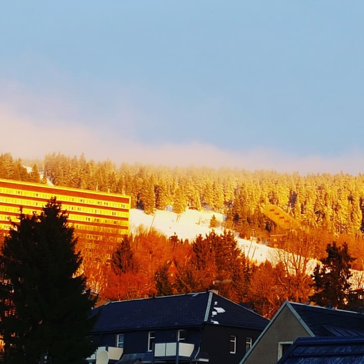 Blick auf den Skihang von unserem Zimmer in der Pension Teuber. Traumhaft