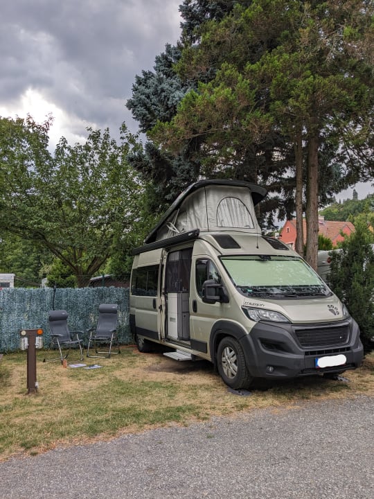 SonstigesUnsere Parzelle, lang genug für unseren 6 Meter Kastenwagen, Platz für Stühle und Tisch seitlich vorhanden