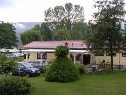 Blick vom Balkon der Pension auf das Restaurant