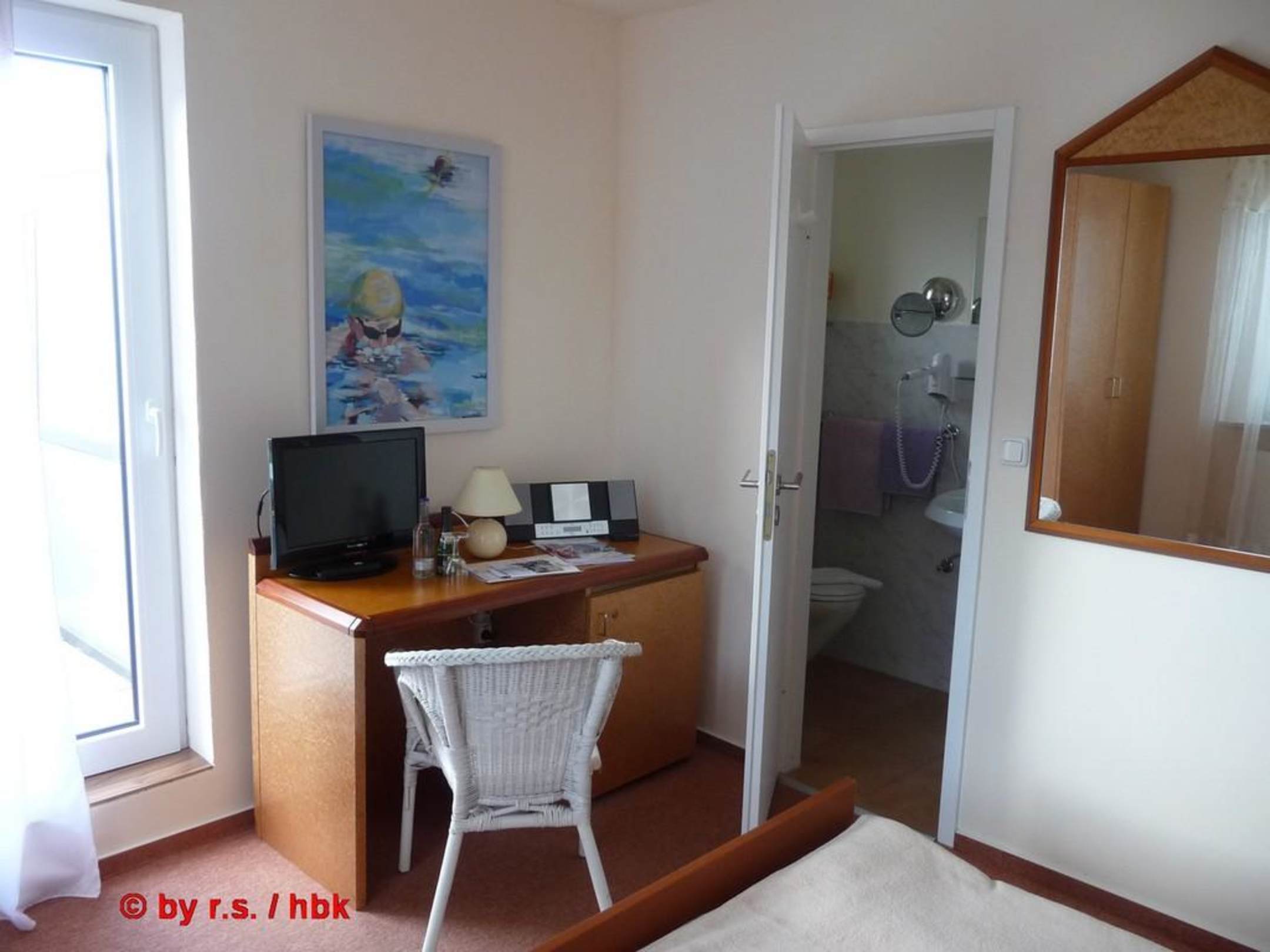 Zimmer, Schreibtisch, TV, Blick Richtung Bad