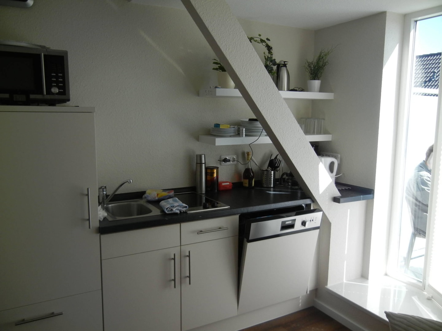 Mikrowelle, Spülmaschine, 2-Platten-Herd, Spülbecken, Kaffeemaschine, Wasserkocher