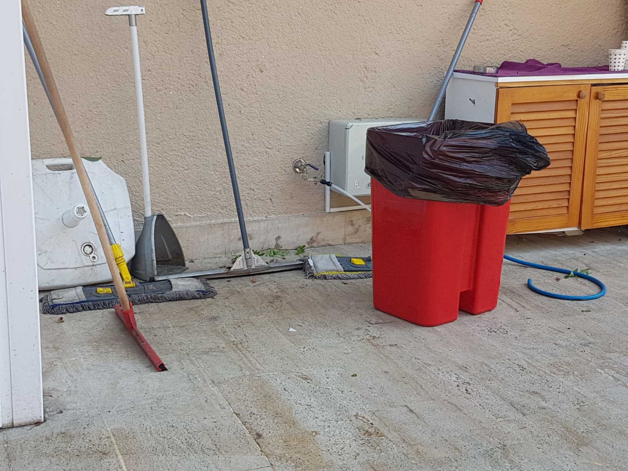 SonstigesAm Poolbereich ist es schmutzig ,Schmutzige Wischer und Besen stehen überall herum .überall ist es schmutzig und staubig