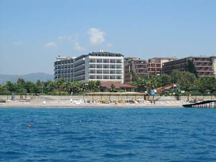 Vanaf de zee op het hotel (links)