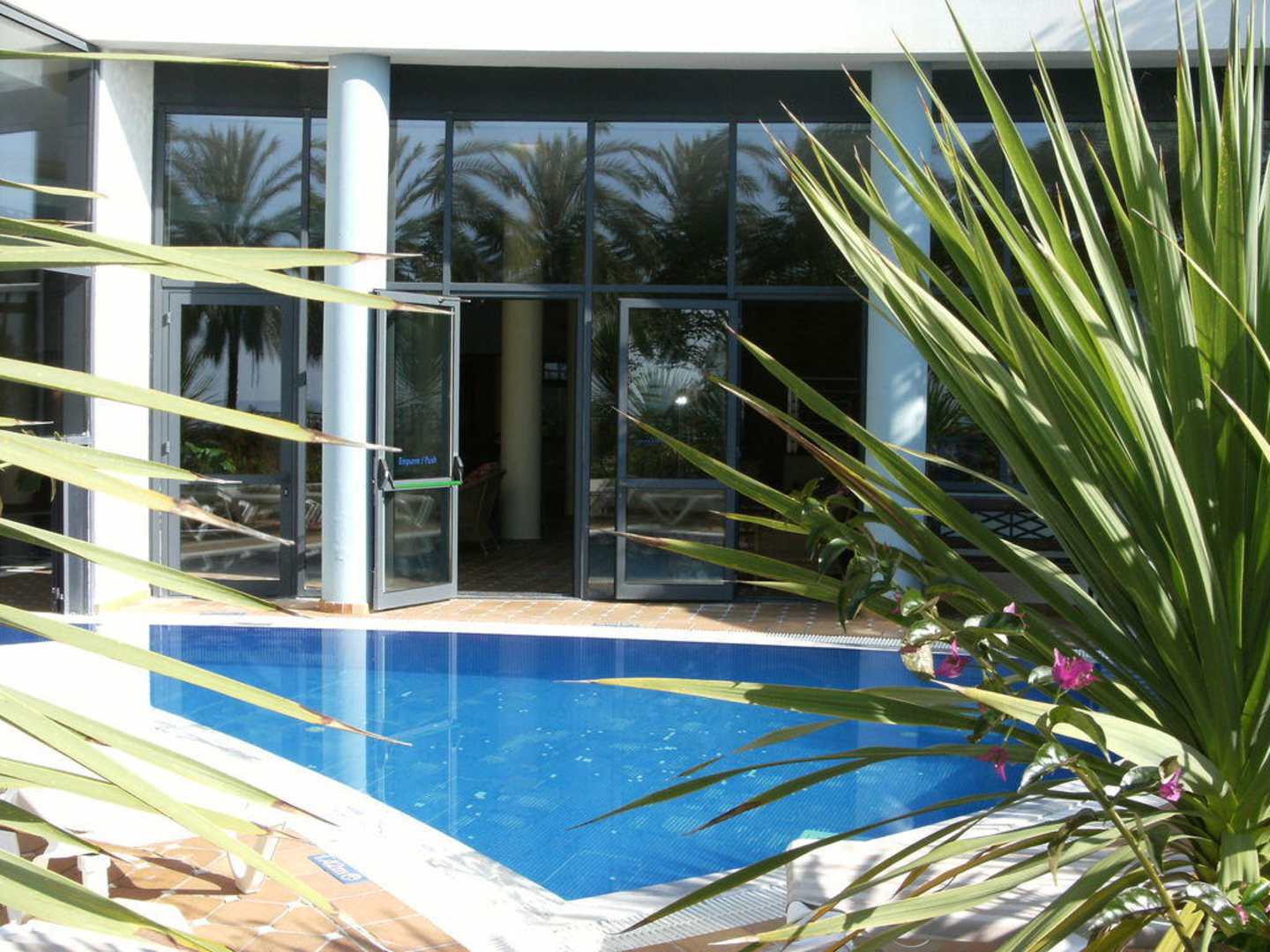 beheizter Innenpool mit Außenbereich und Sonnenliegen