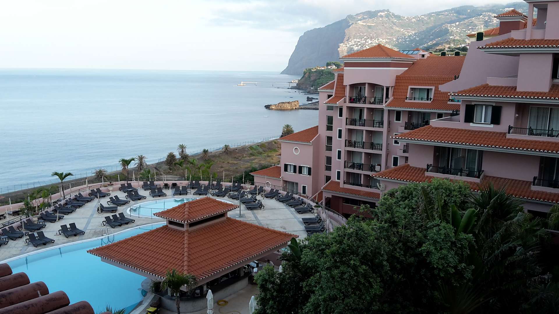 Blick aus Zimmer 735 auf zwei Außenpools, die Poolbar und den Cabo Girão.
