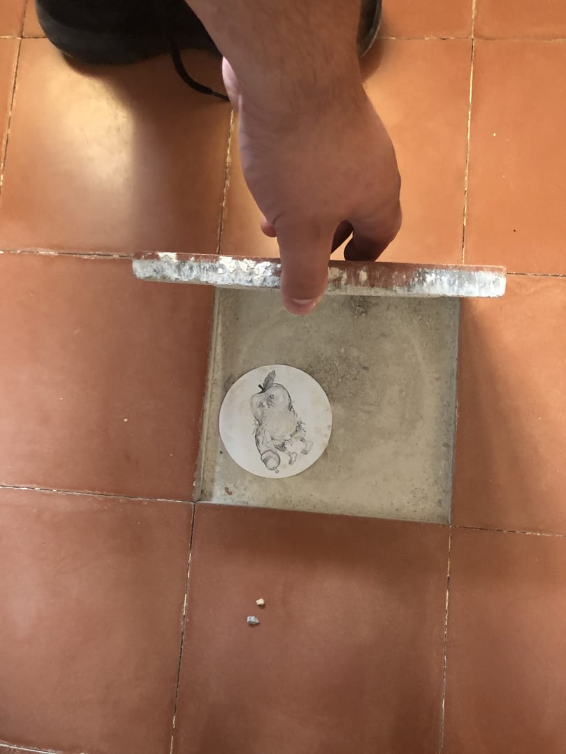 Lose Fliesen - dieses sogar mit Bild von einem der vorherigen Besucher. „Der Fliesen-pimmel“