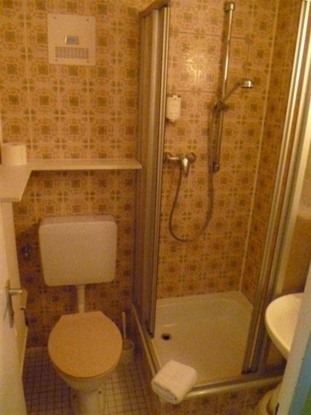 3qm Bad mit DuscheDas war schon der Hammer für 4*plus. Ein kleines Bad, das zwar sauber war, aber bestimmt schon 30 unrenovierte Jahre hinter sich hat.
