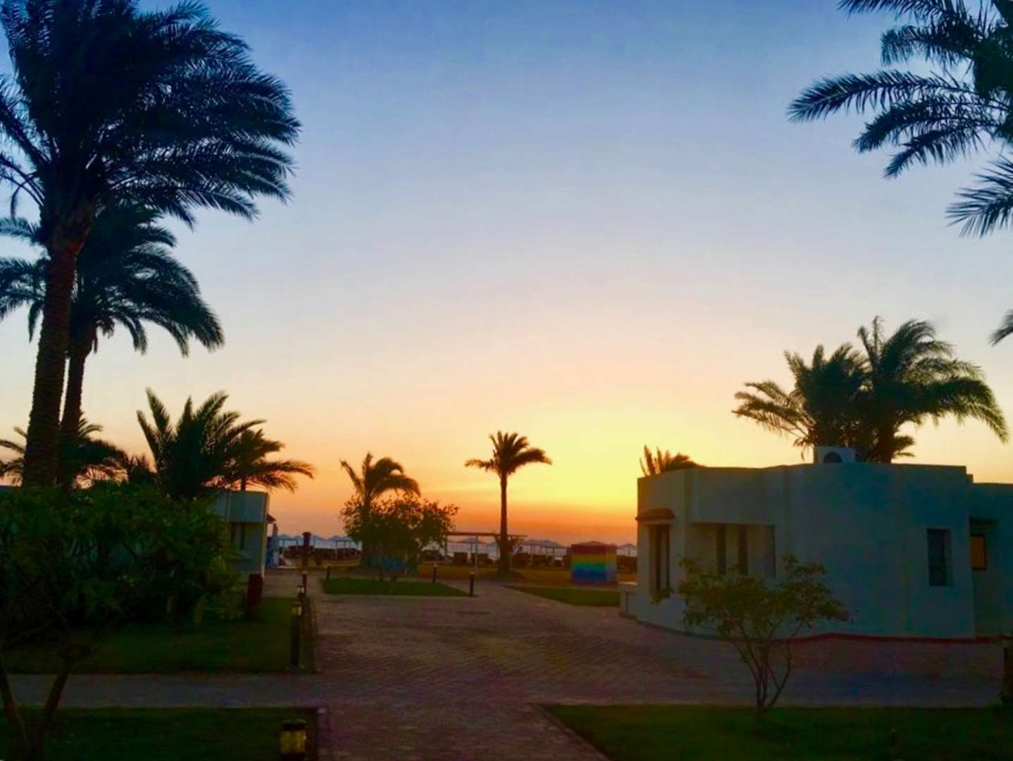 Ausblick aus Bungalow Nr. 567 in Richtung Meer. Sonnenaufgang.