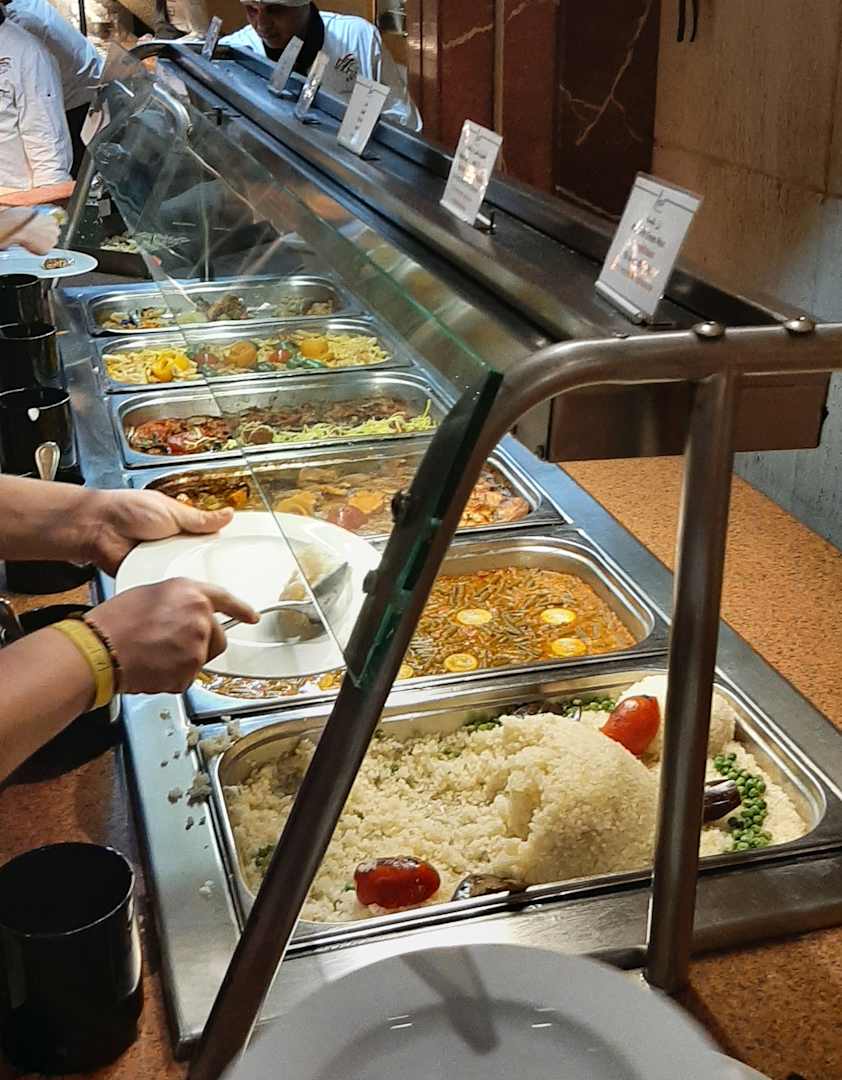 Essen auf Kantinenniveau, Reis, Nudeln, Kartoffelbrei, Gemüse, kaum Fleisch