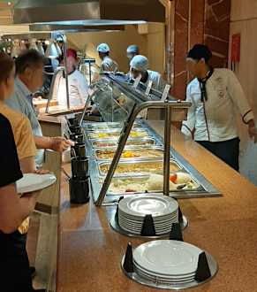 Essen auf Kantinenniveau, Reis, Nudeln, Kartoffelbrei, Gemüse, kaum Fleisch