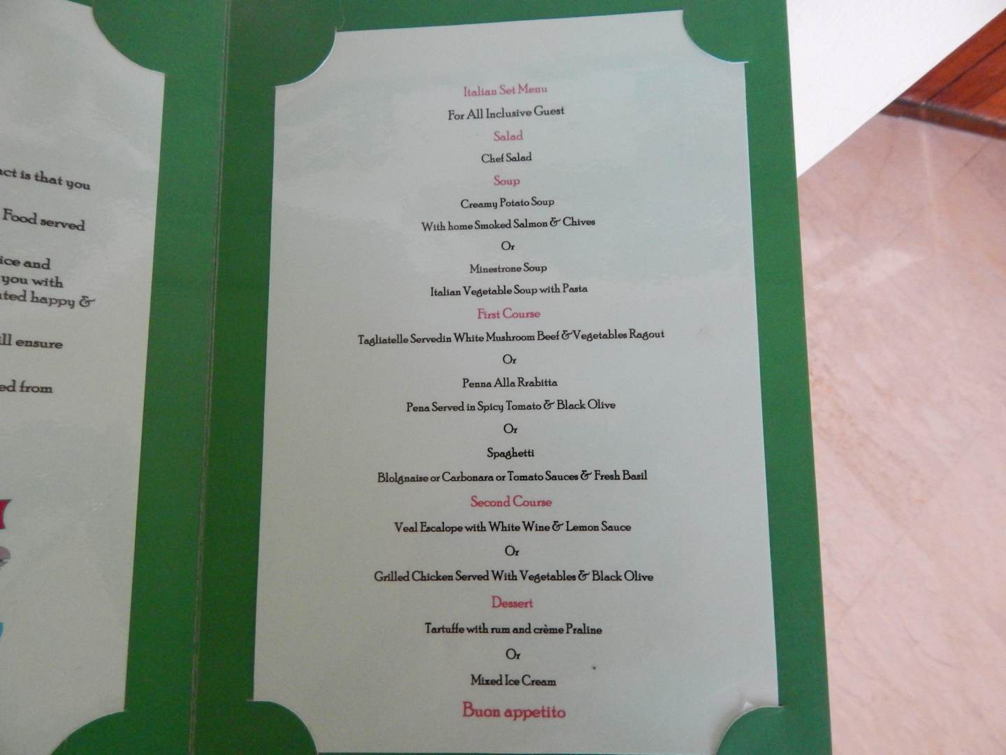 Menu of the Italian rest.