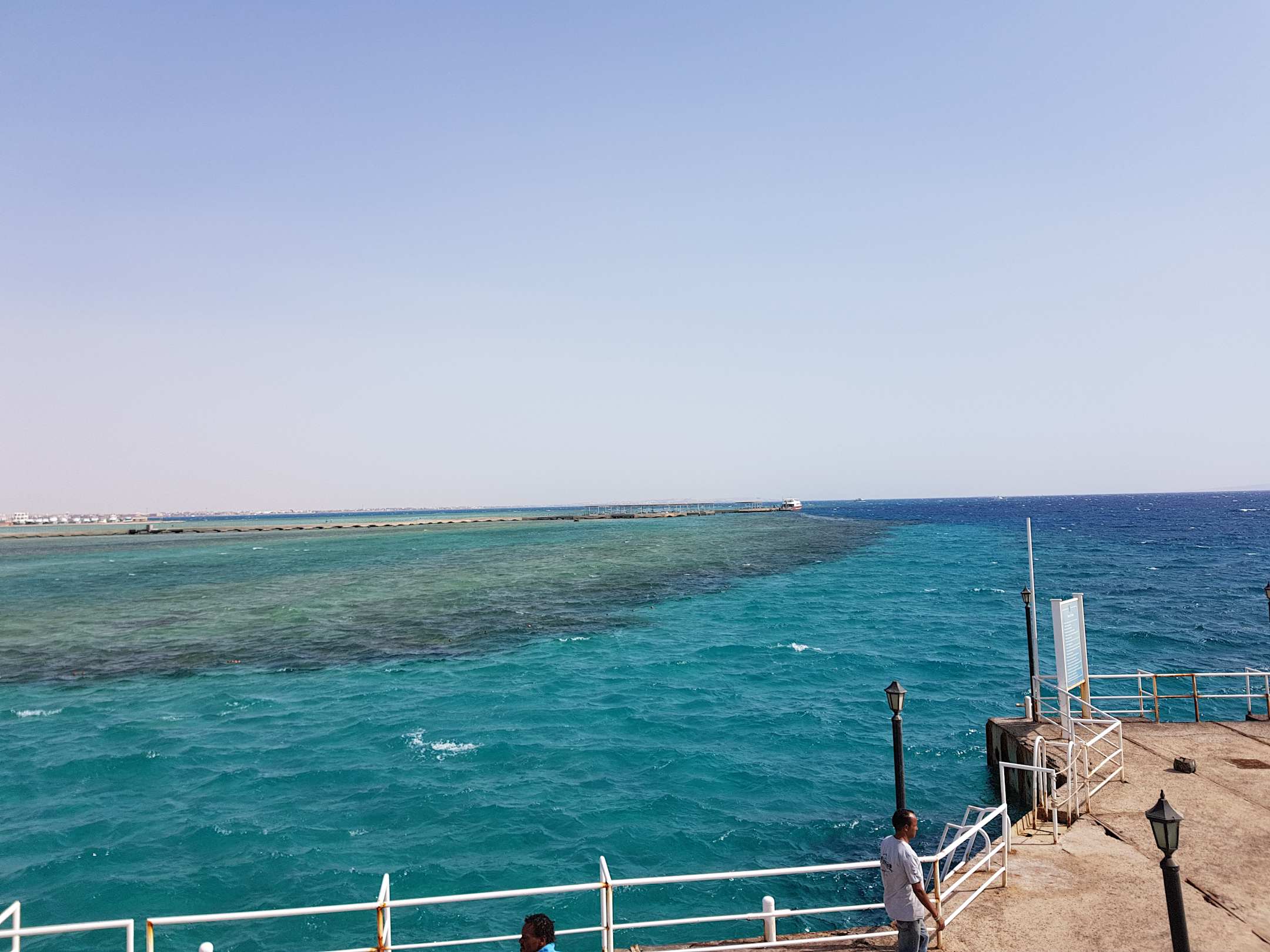 StrandAusblick vom Ende des "langen" Steges. Zu sehen ist die ca 250m lange Riffkante, welche sich sehr gut zum Schnorcheln eignet.