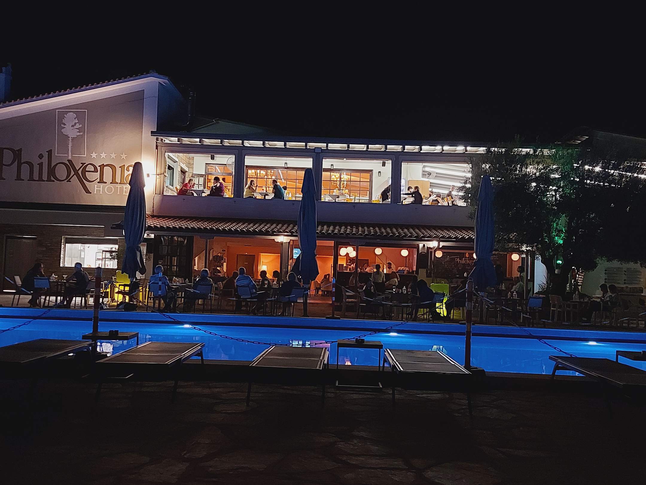 unten die Poolterrasse, davor der Pool, alles eng beieinander