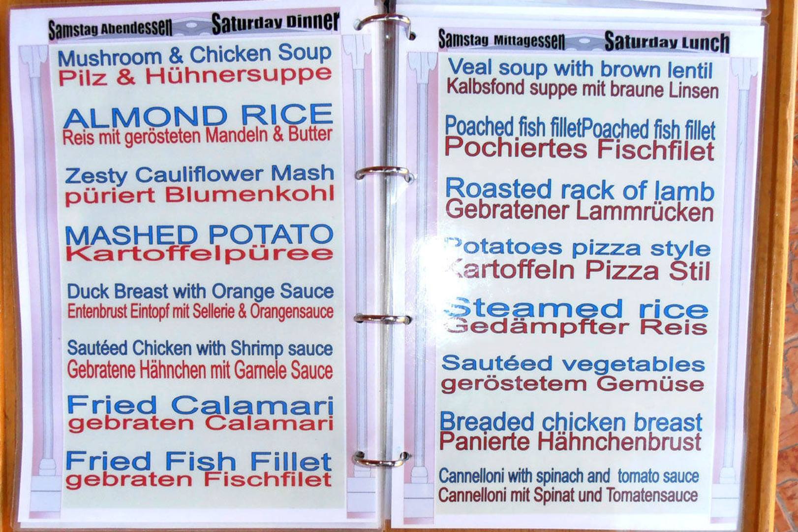 Speisekarte im Hauptrestaurant