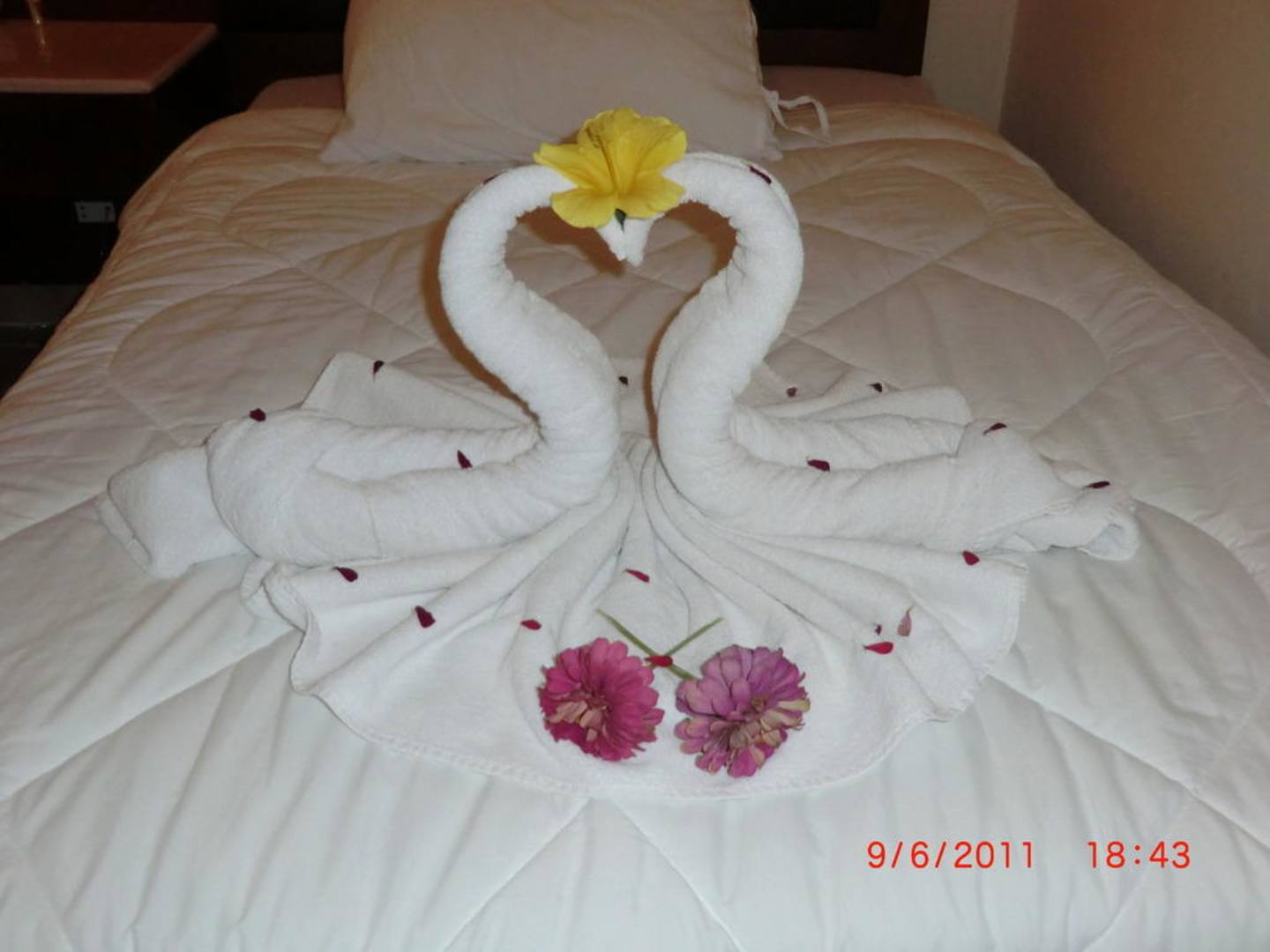 Nette Dekoration auf dem Bett vom Zimmerservice