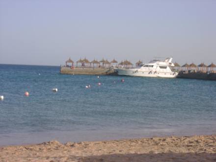 На снимке изображен пляж отеля Aqua Vista & Spa,рядом с которым есть пирс и яхта.
