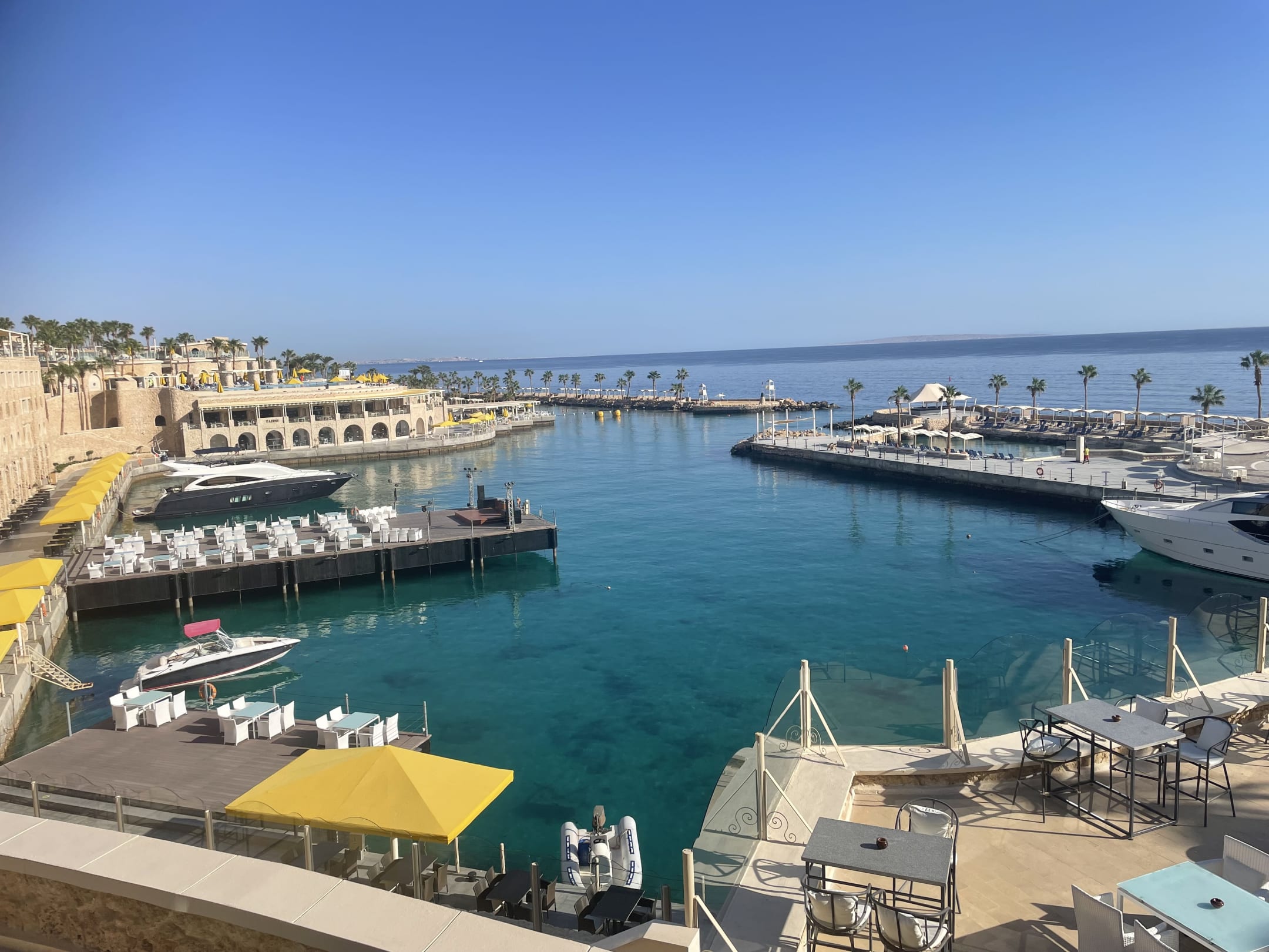 Blick vom Haupthaus, Richtung Hafen, Lagune und Meer.