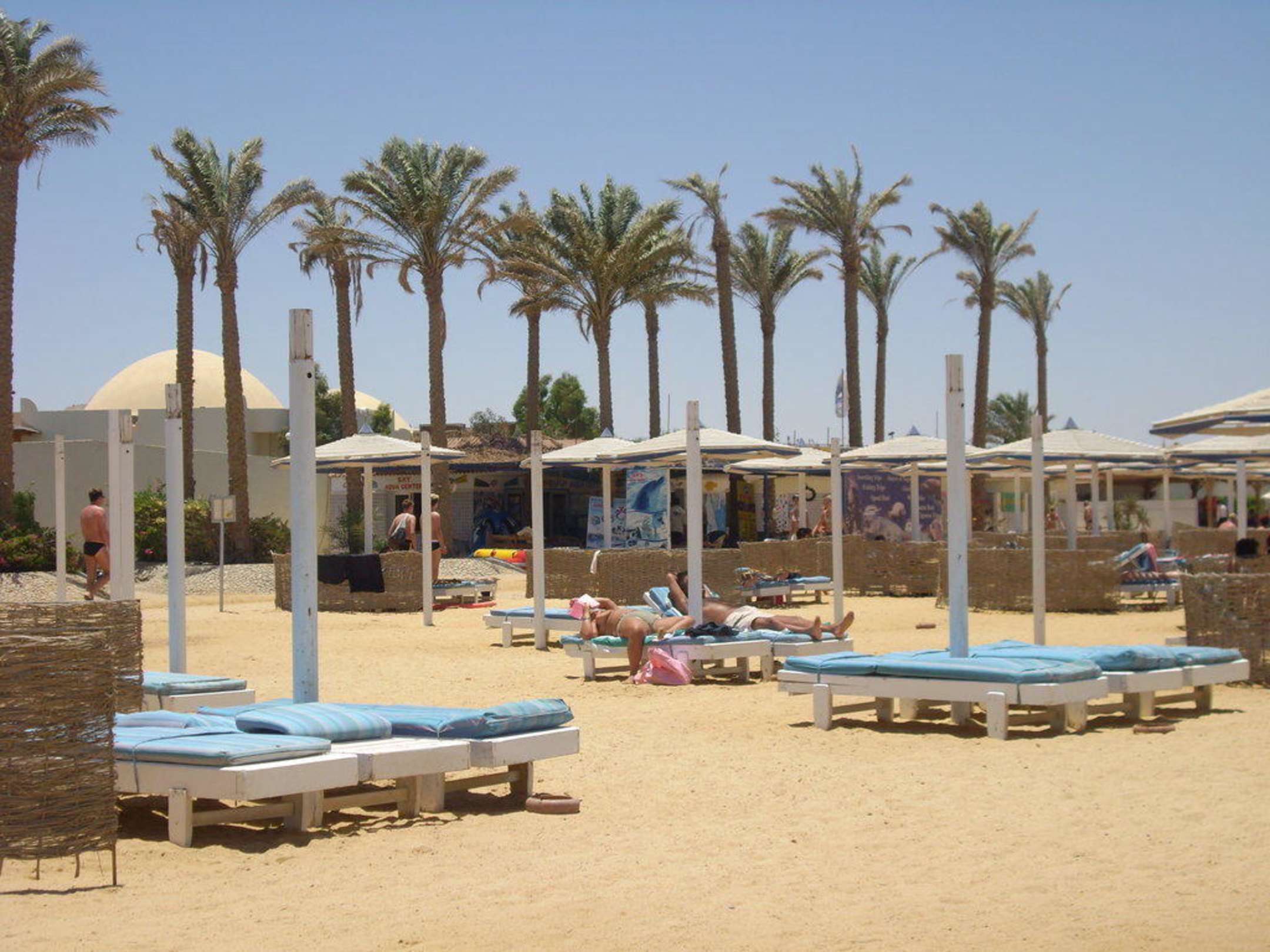 Hier gibt es neue Sonnenschirme im hinteren Teil des Strandes